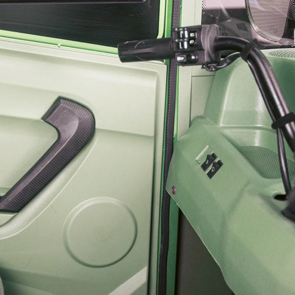 Модель оснащена современным тяговым бесщеточным новым мощным мотором с параметрами 1000 Вт. Такая начинка улучшает скоростные характеристики техники. Электротрицикл быстро развивает скорость до 25 км/час. Откидные борта кузова позволяют легко выгружать крупногабаритный груз. Герметично закрытая кабина допускает езду при любых погодных условиях, открывается с двух сторон.