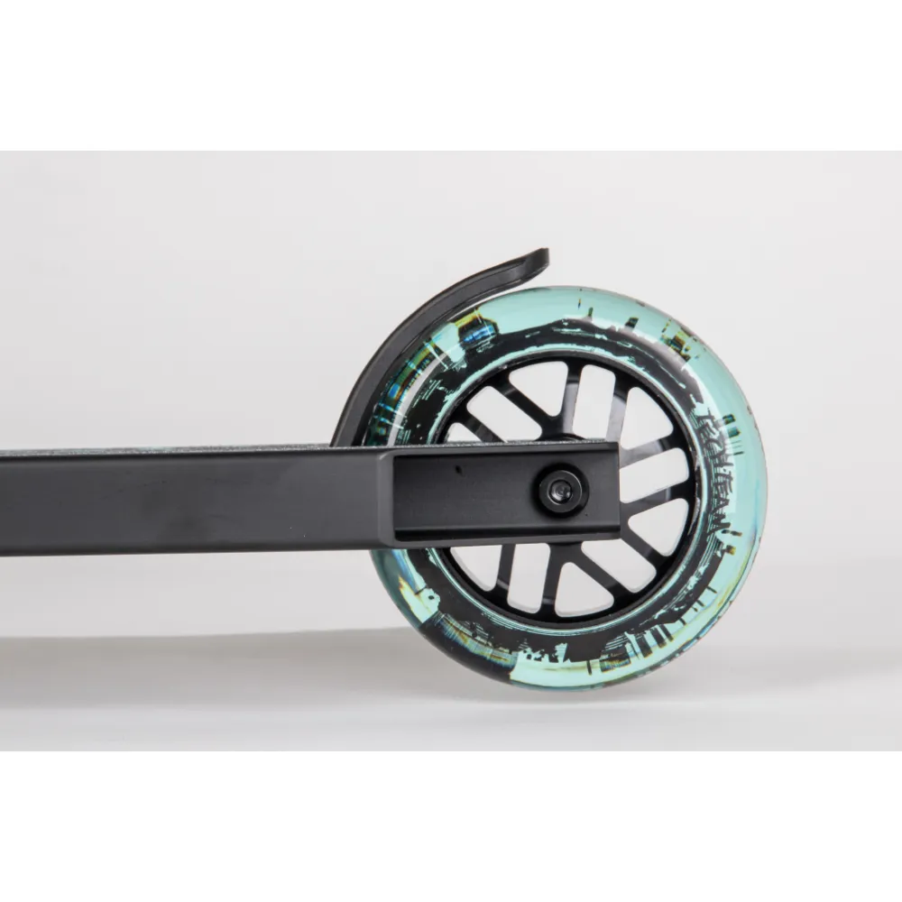 Качественная колесная часть с черно-бирюзовыми полиуретановыми колесами способна сотворить чудеса, выполнять рискованные трюки слушаясь пользователя на 100 %.
